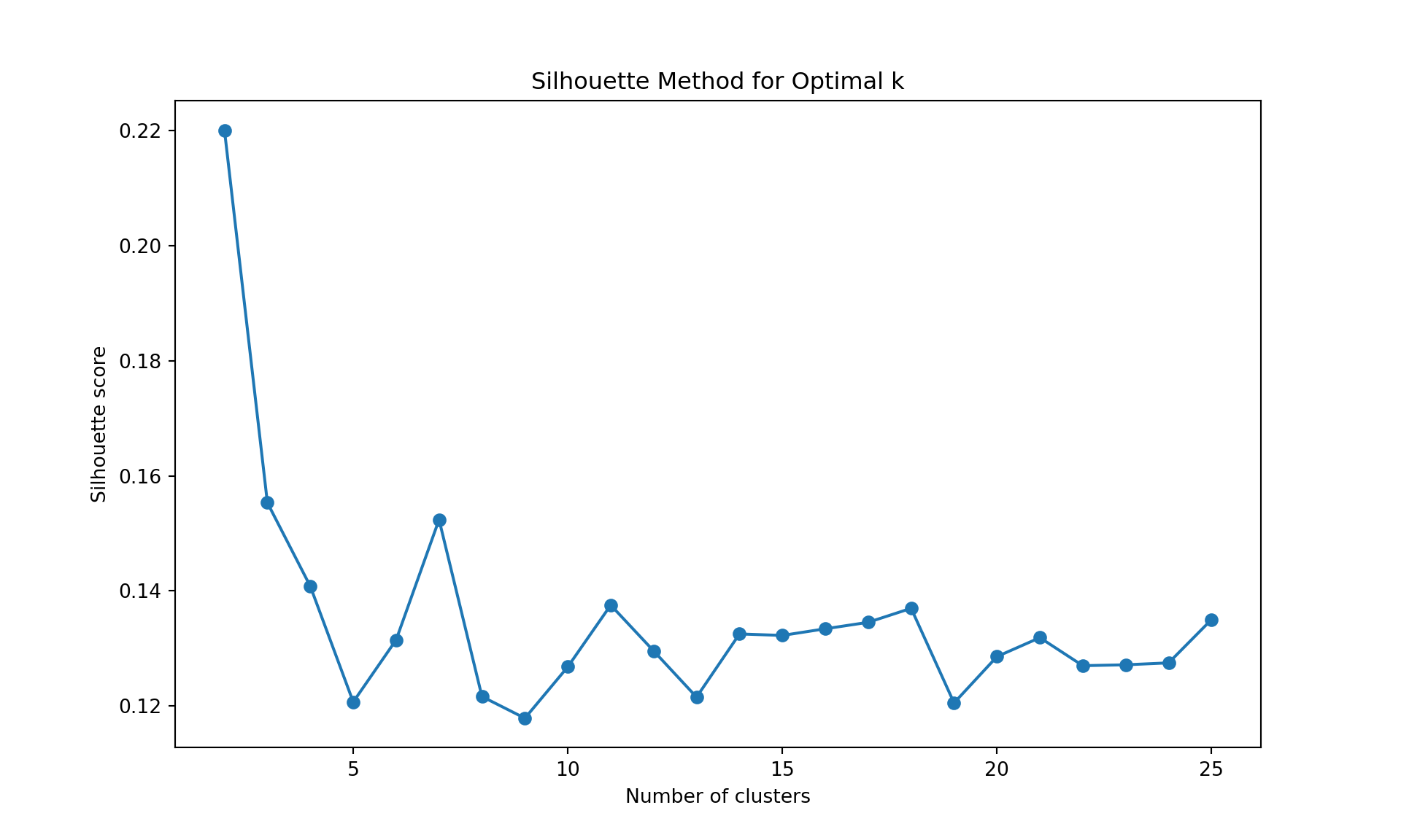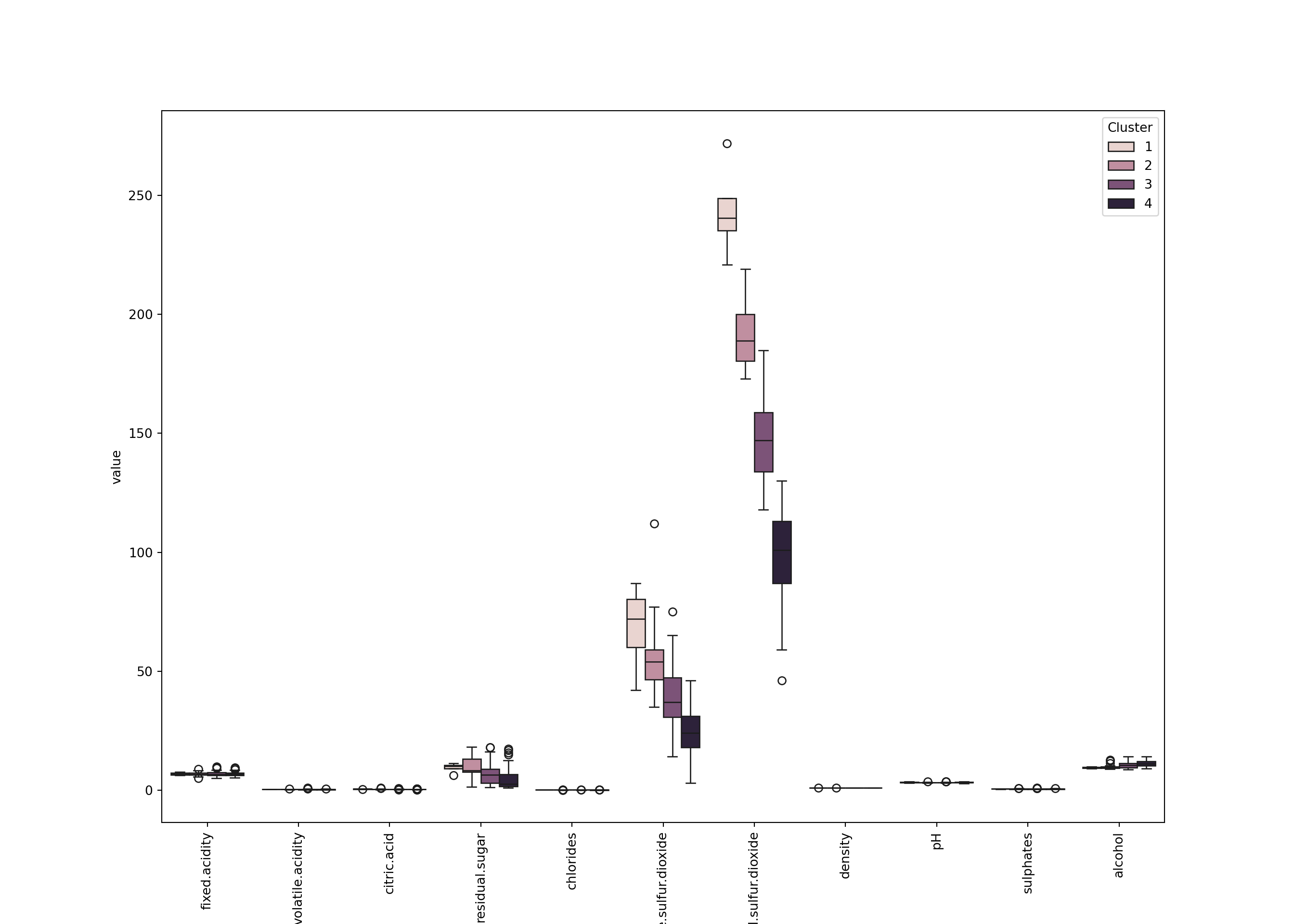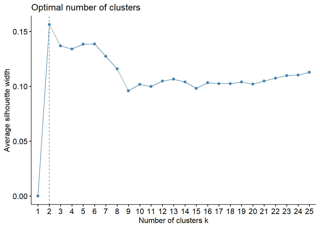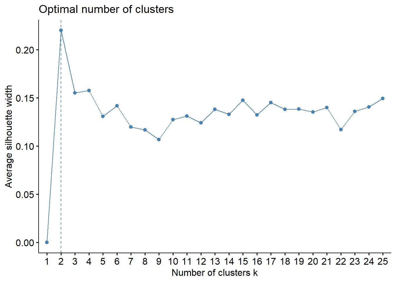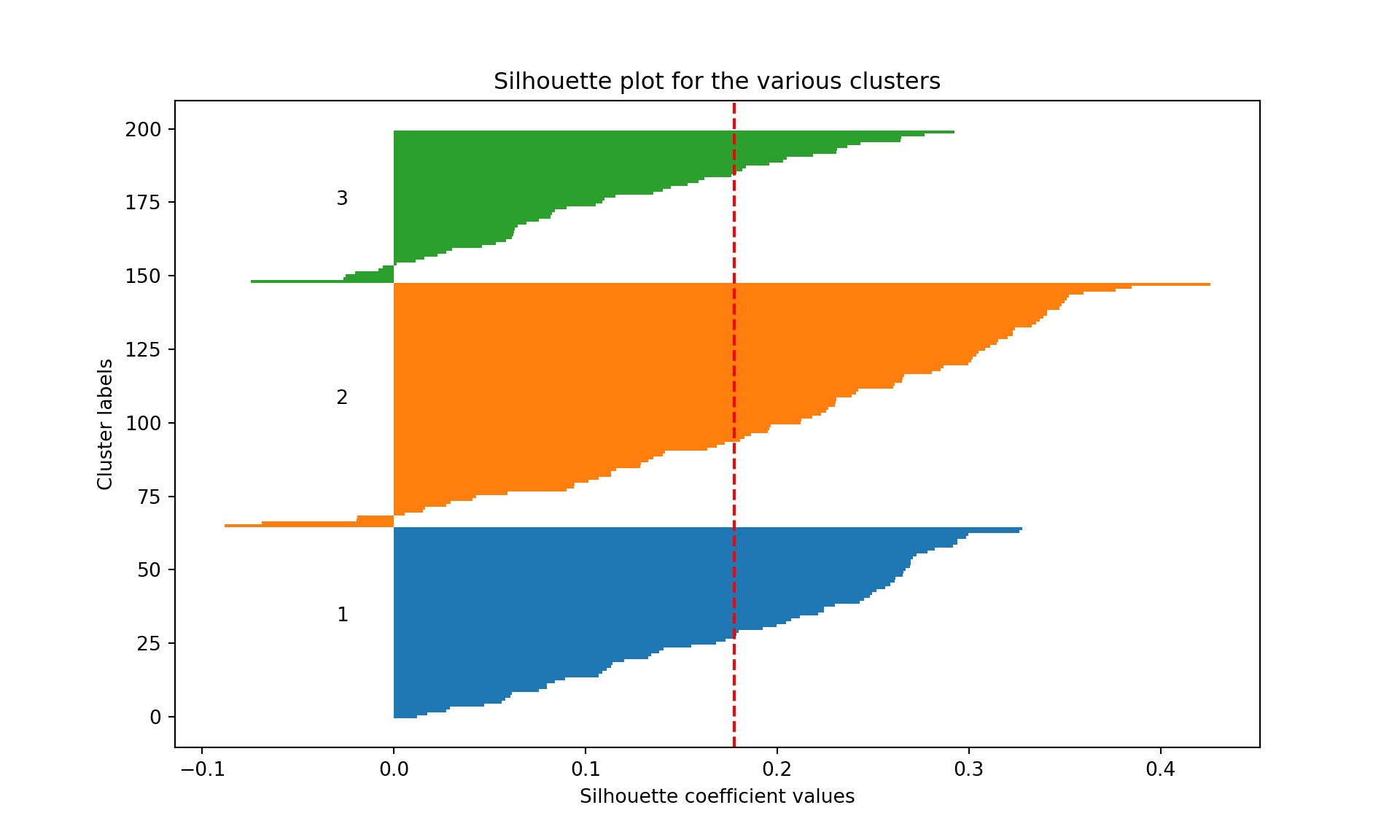 We see that the average silhouette considering the all three clusters is 0.12. Cluster 2 has some wines badly clustered (silhouette of 0.06, the lowest, and several wine with negative silhouettes). Cluster 3 is the most homogeneous cluster and the best separated from the other two.