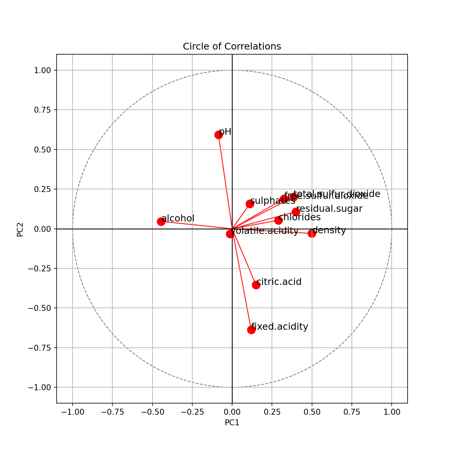 We can represent the wines in the (PC1,PC2) map. To better interpret the map, we add on it the correlation circle: a biplot.