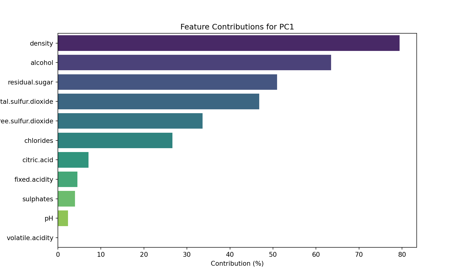 density, negatively withalcohol. Which confirms that these two features are negatively correlated. It is also positively correlated withresidual.sugar. - PC2 is positively correlated with