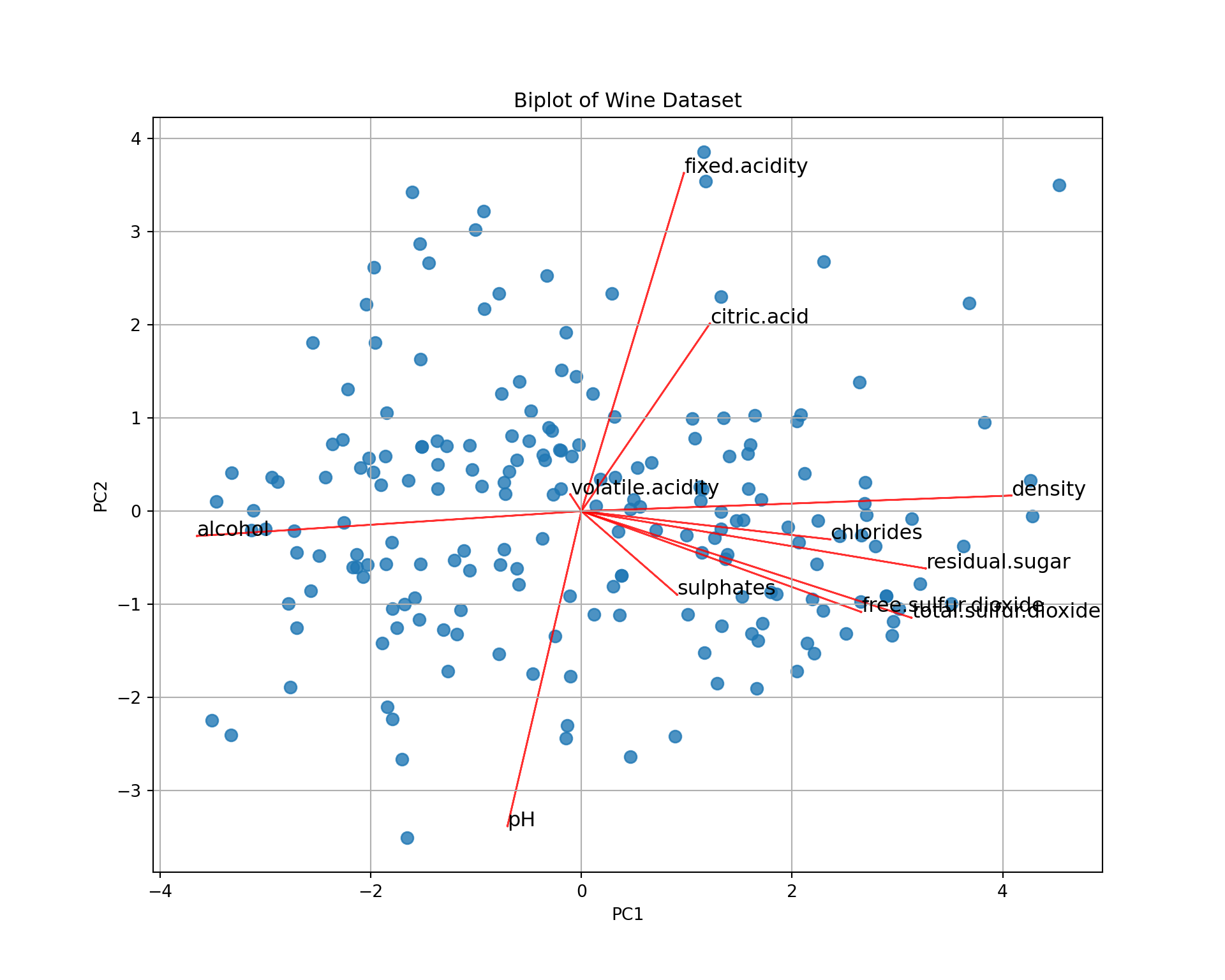 The object wine_pca contains all the PCA results. We will analyze them now.