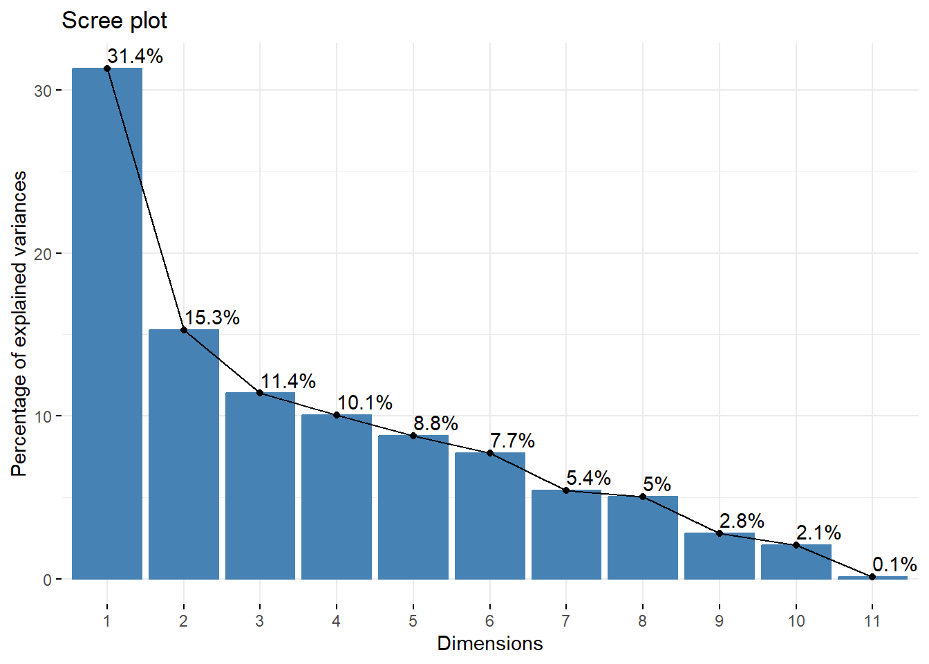 Note: we require ncp=11 because there can be 11 principal components (same as features), and that we want to keep the results for all the principal components. The results will not change if we set ncp=5 for example. It is just that only 5 PCs will be kept in the R object.