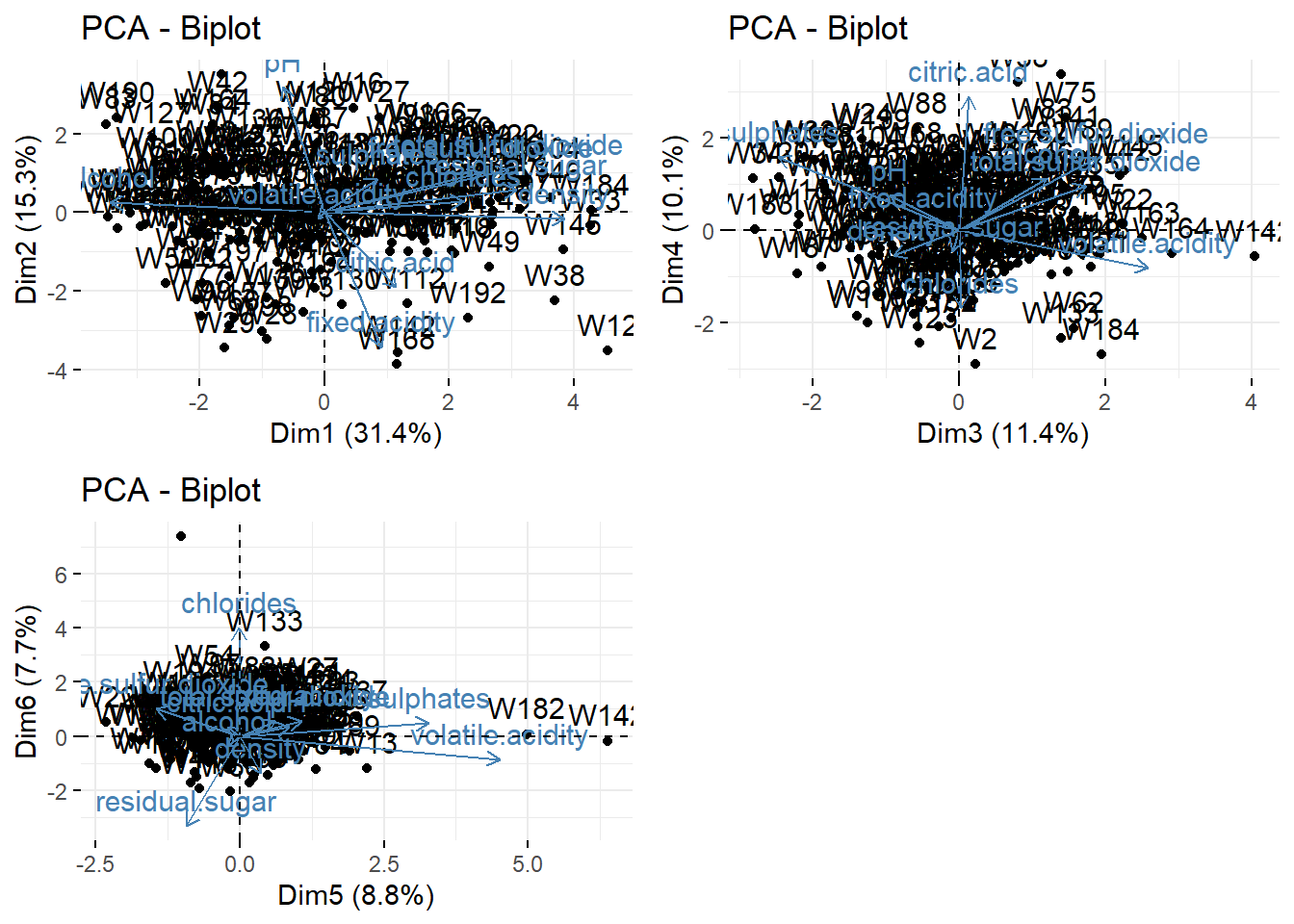 If we want to achieve \(75\%\) of representation of the data (i.e., of the variance of the data), we need 5 dimensions. This means that the three biplots below represent \(>75\%\) of the data (in fact \(84.6\%\)).