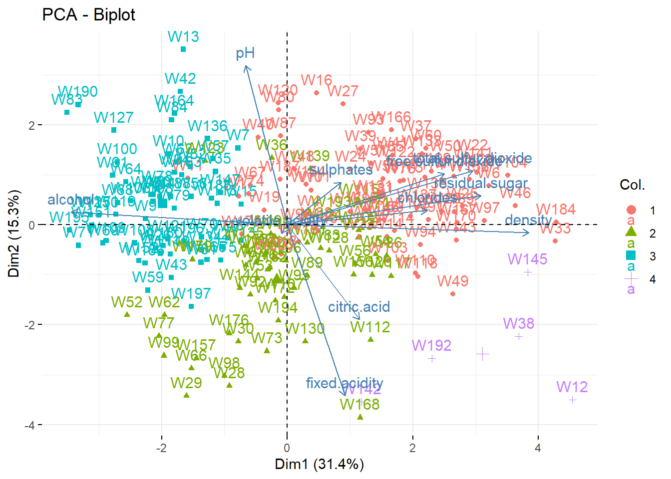 First, we make a clustering (below \(k=4\) for the example). Then, we use the group (as factors) to color the individuals in the biplot.