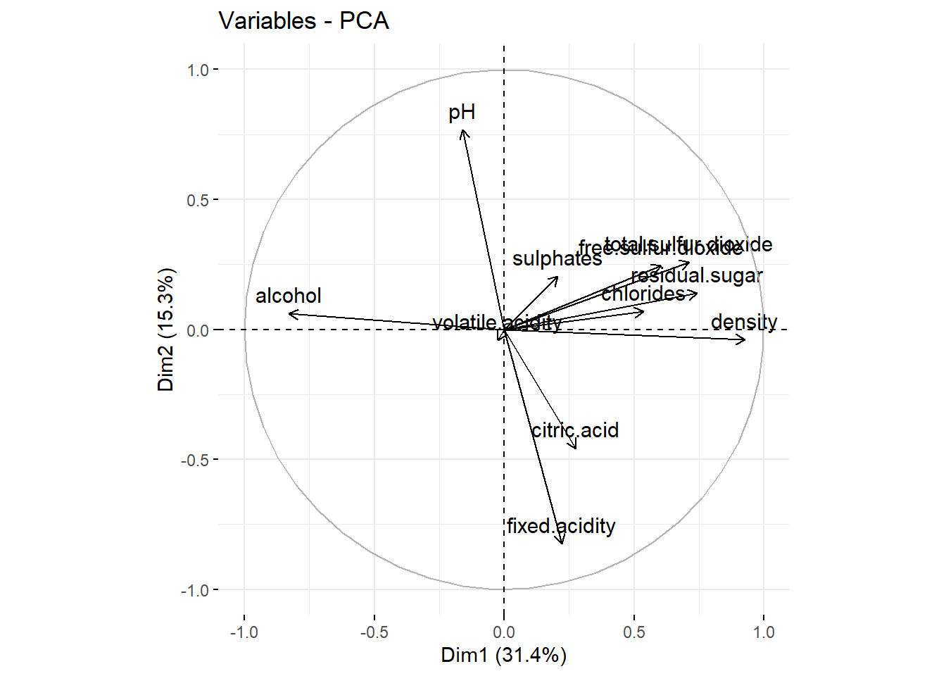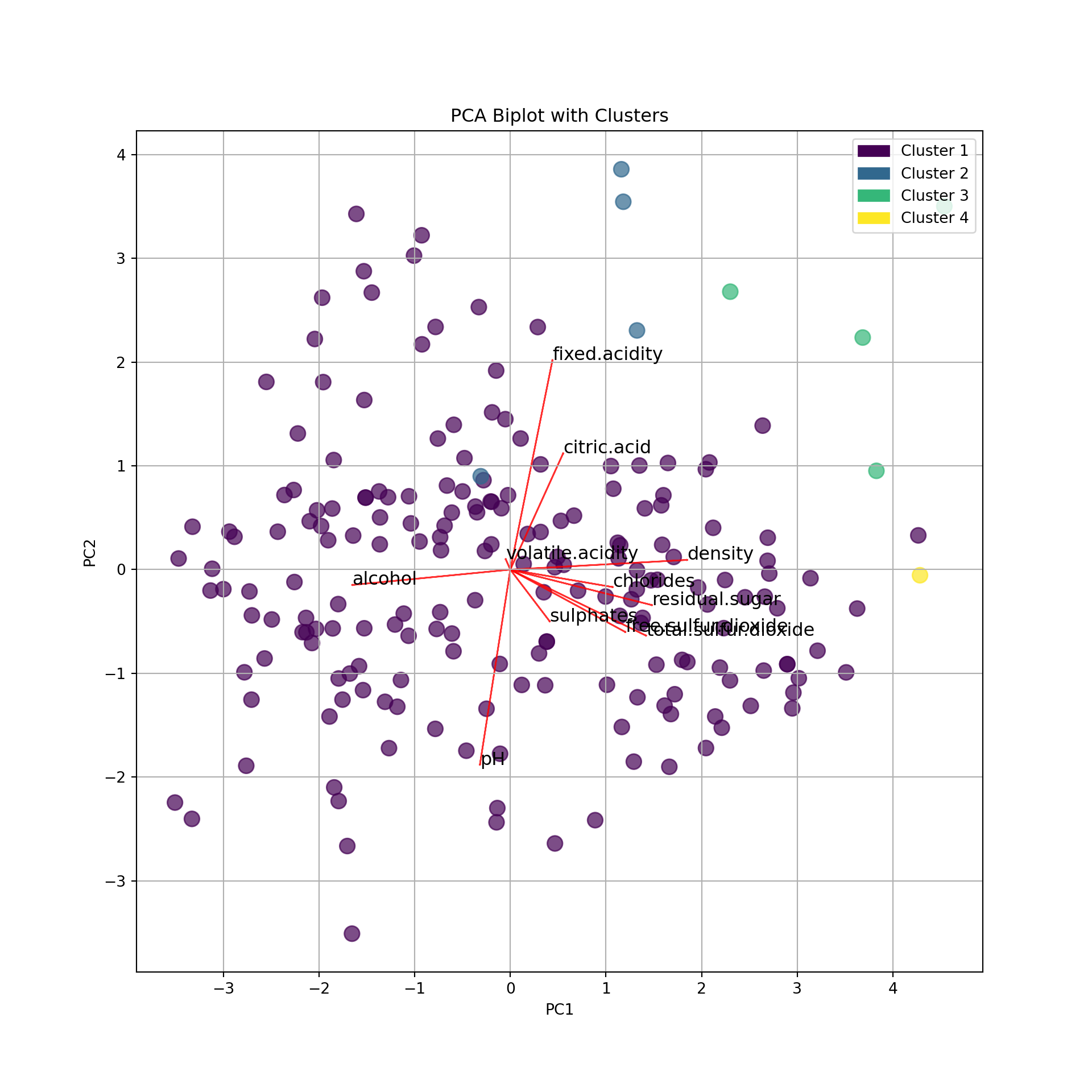 - Cluster 1: larger PC1 and PC2. That is, large pH (low acidity) and large density, residual sugar (low alcohol), etc.